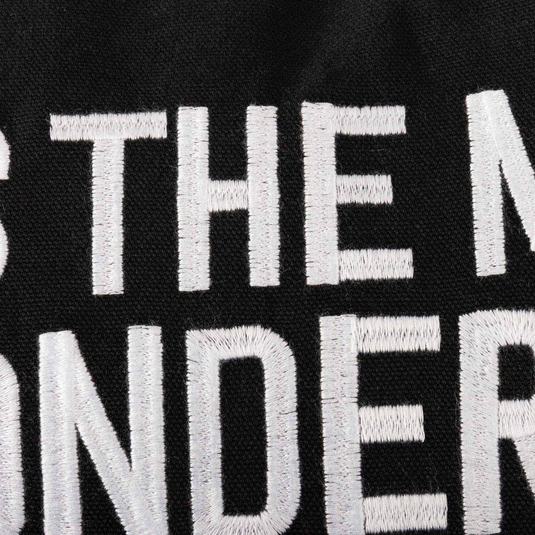 Embroidered white text on black background