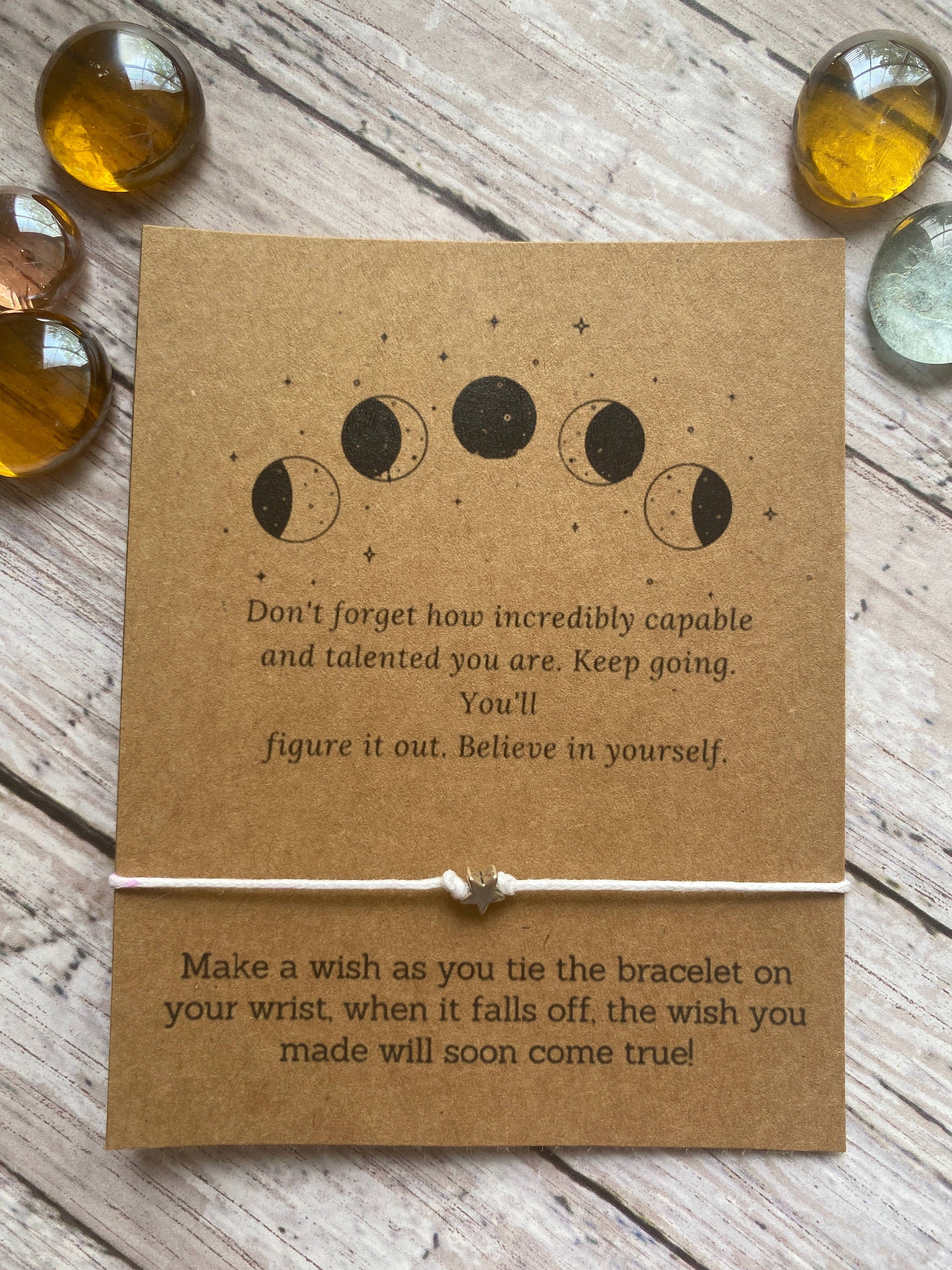 Handmaid wish bracelet with a beautiful massage, perfect for gifting to someone special, includes a 1mm cord bracelet, each with a silver star charm. Massage is printed on a high-quality kraft card and presented in a clear cellophane sleeve,