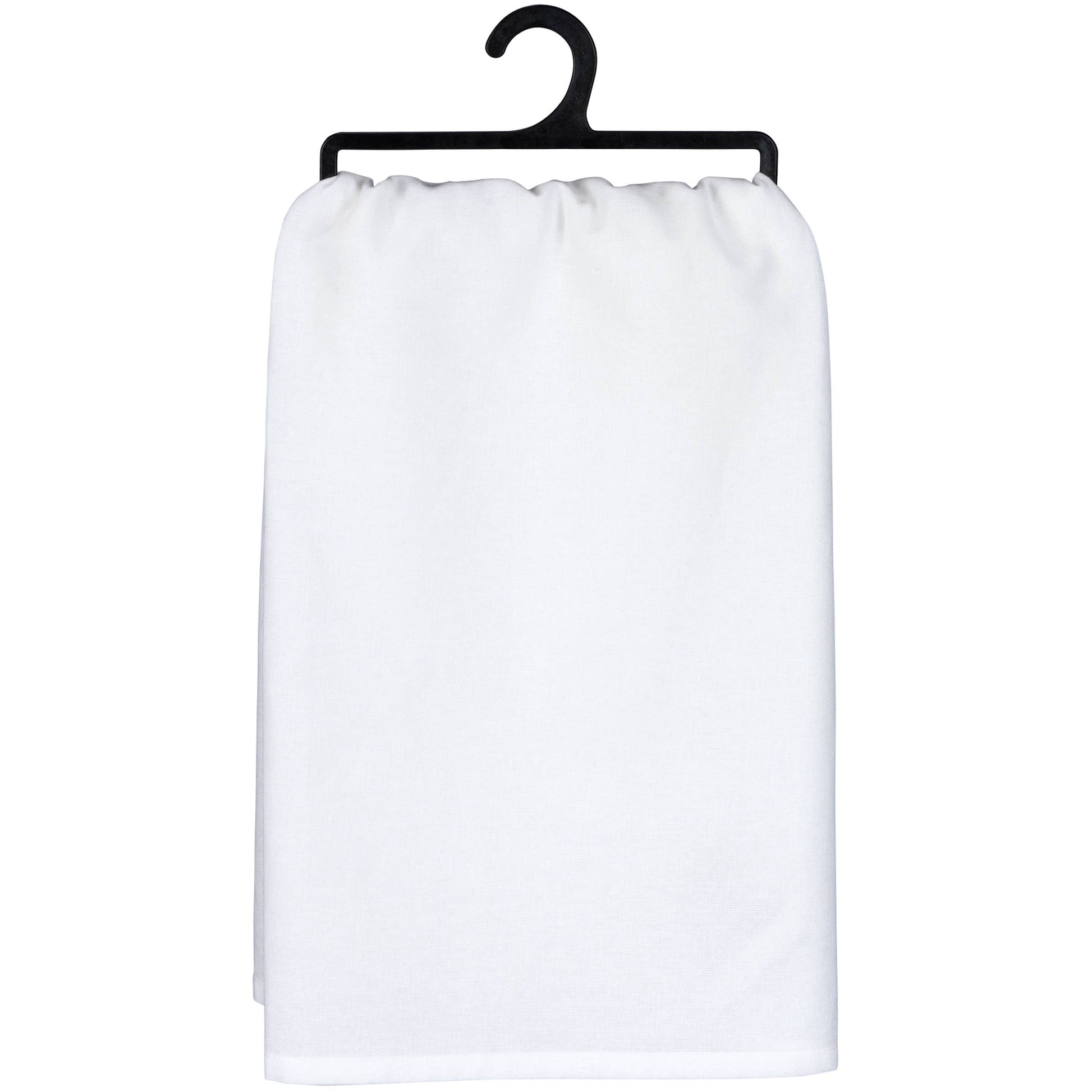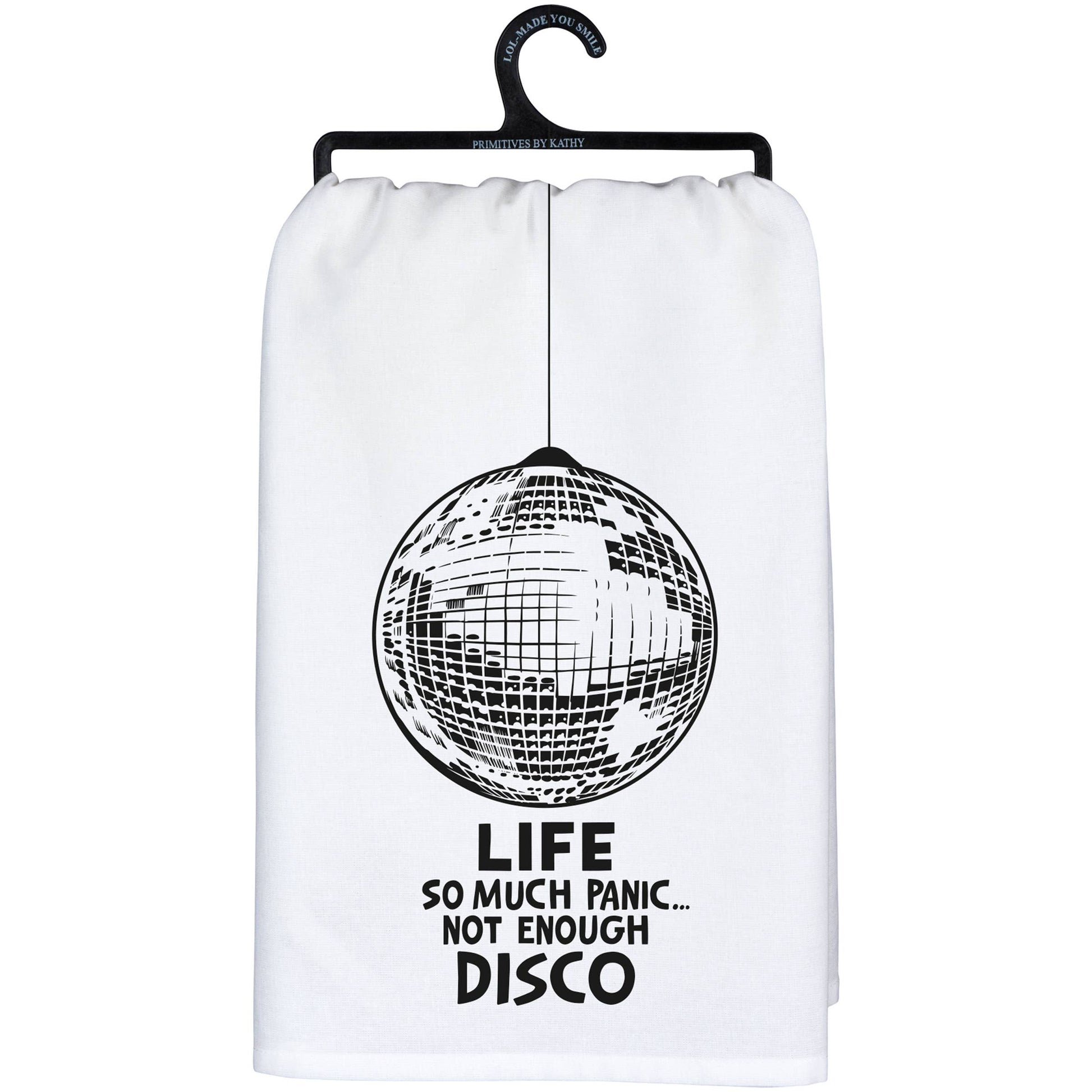 This black and white cotton kitchen towel features a hand-illustrated disco ball and the playful sentiment “Life – So Much Panic… Not Enough Disco.” A fun, functional kitchen accent made for everyday use.